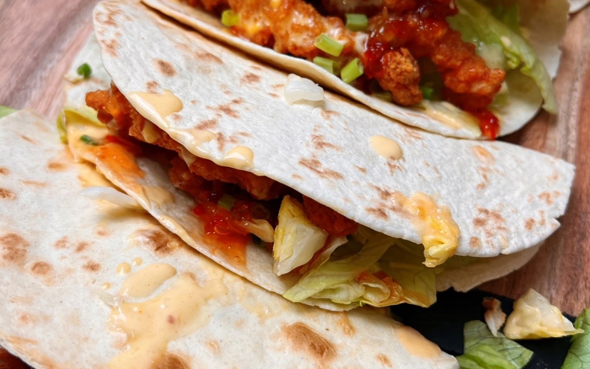 - Build your tacos - fill each wrap with lettuce, crispy chicken, cheese sauce and some of the sweet chilli sauce.