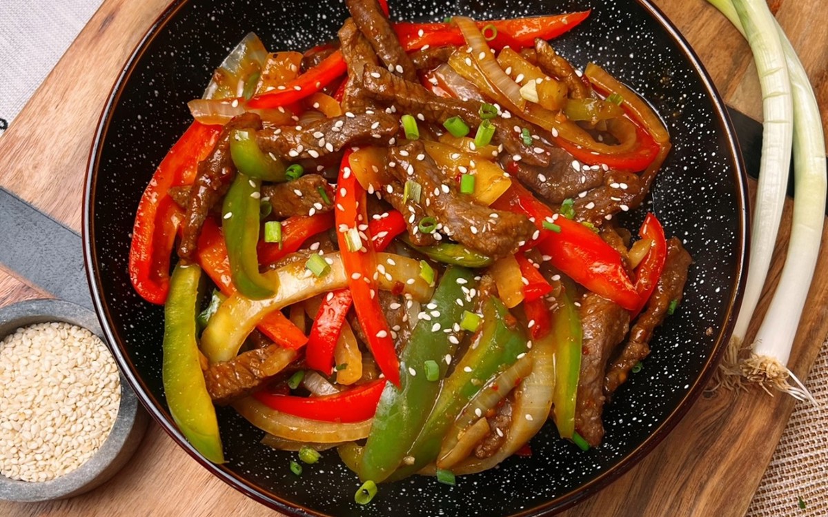 - Cut steak into thin strips, add to a bowl and add in cornflour. Combine well. Cook steak for 7-9 mins in air fryer/ oven until crispy.