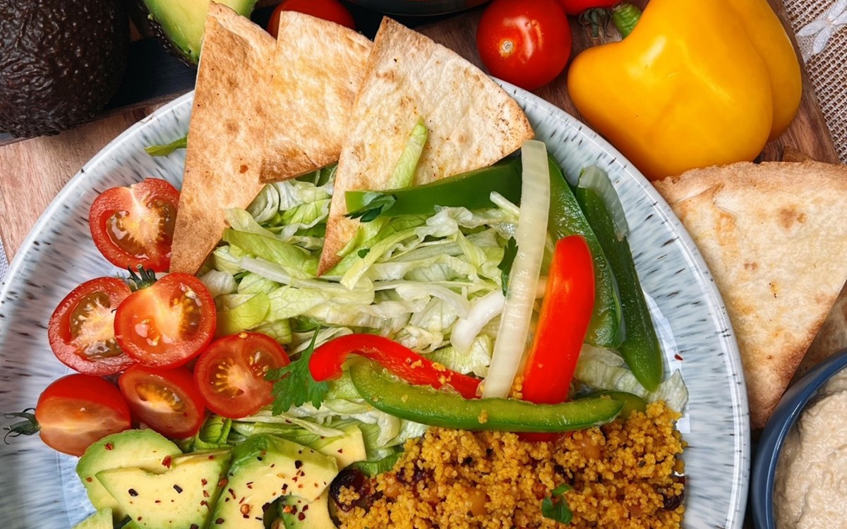 - Plate up your salads with houmous, cous cous, avocado, lettuce, tomato, peppers, onion and crispy tortillas.