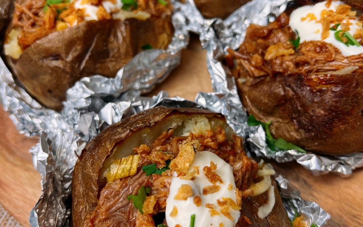 - Top each baked potato with BBQ pulled pork and some crispy onions and parsley.