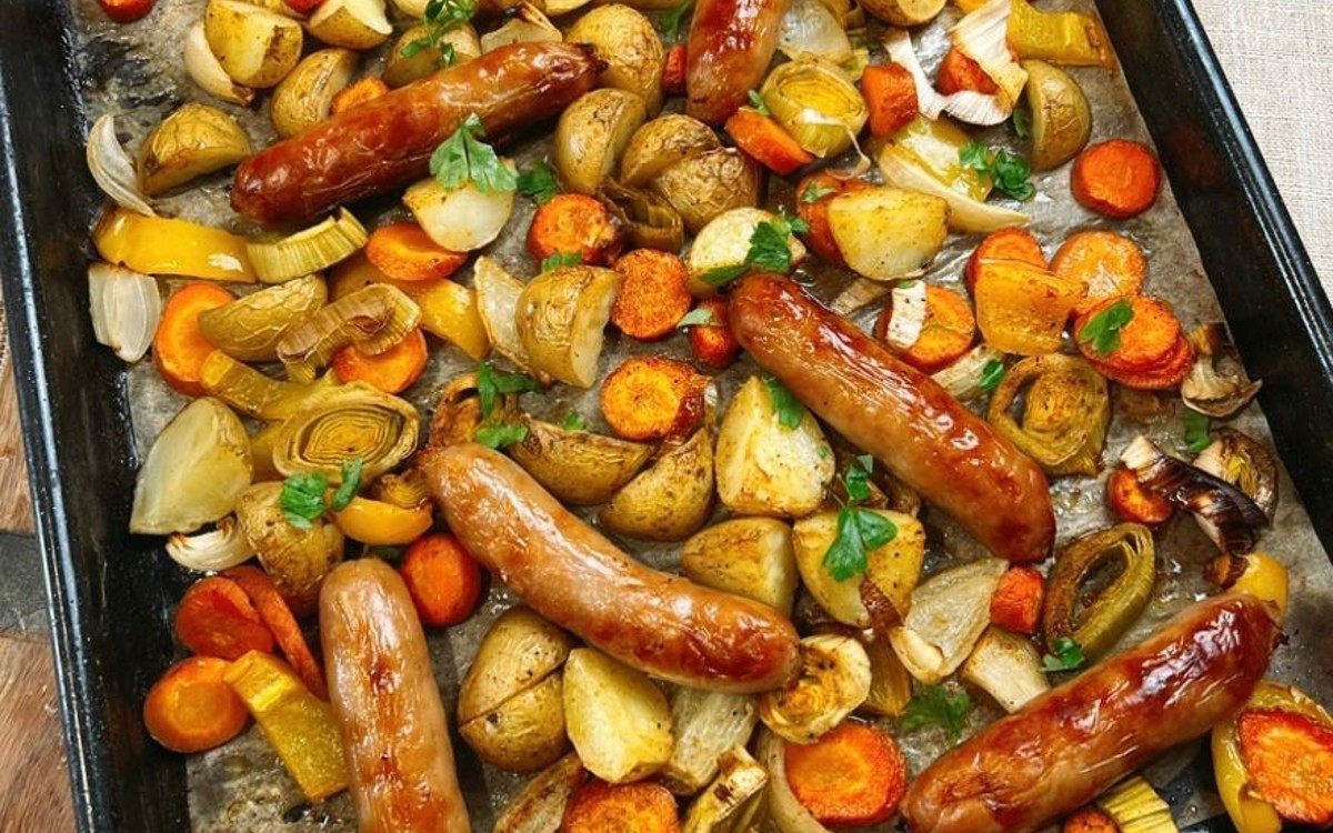 - After 30 mins of cooking add your sausages onto tray and coat with honey and paprika. Cook until sausages cooked through (approx. 15 mins) - turn sausages throughout.