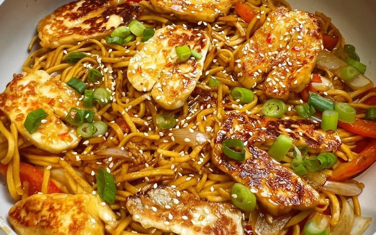 - Serve the halloumi with your noodles and finish with spring onions and sesame seeds.