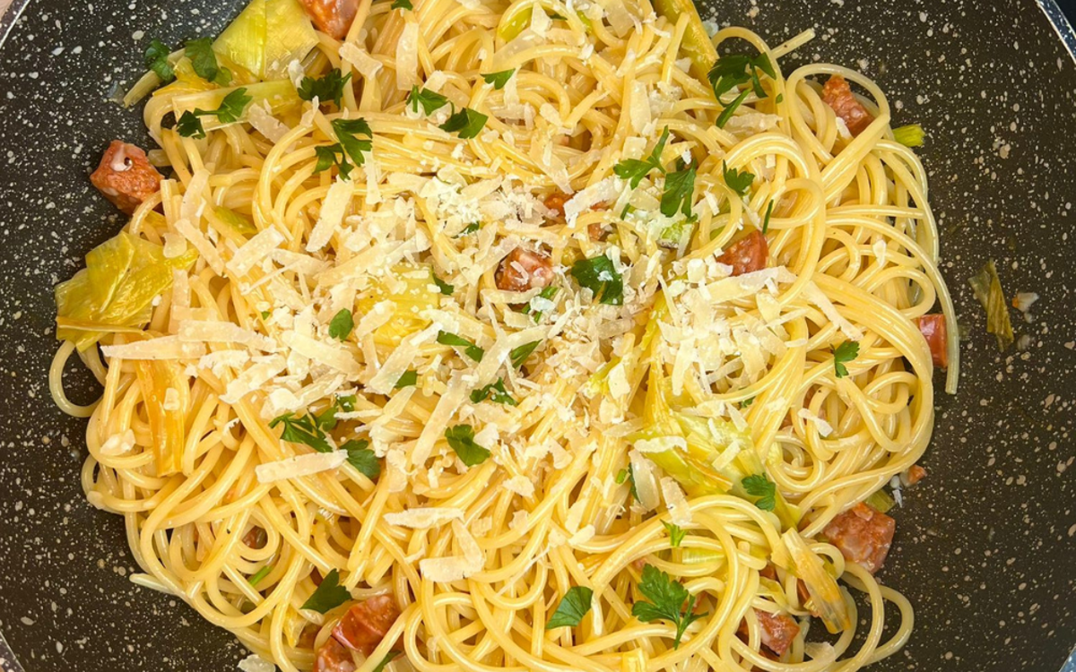 - In a pan add butter and leeks and cook these off. Add in your chorizo and mix well.