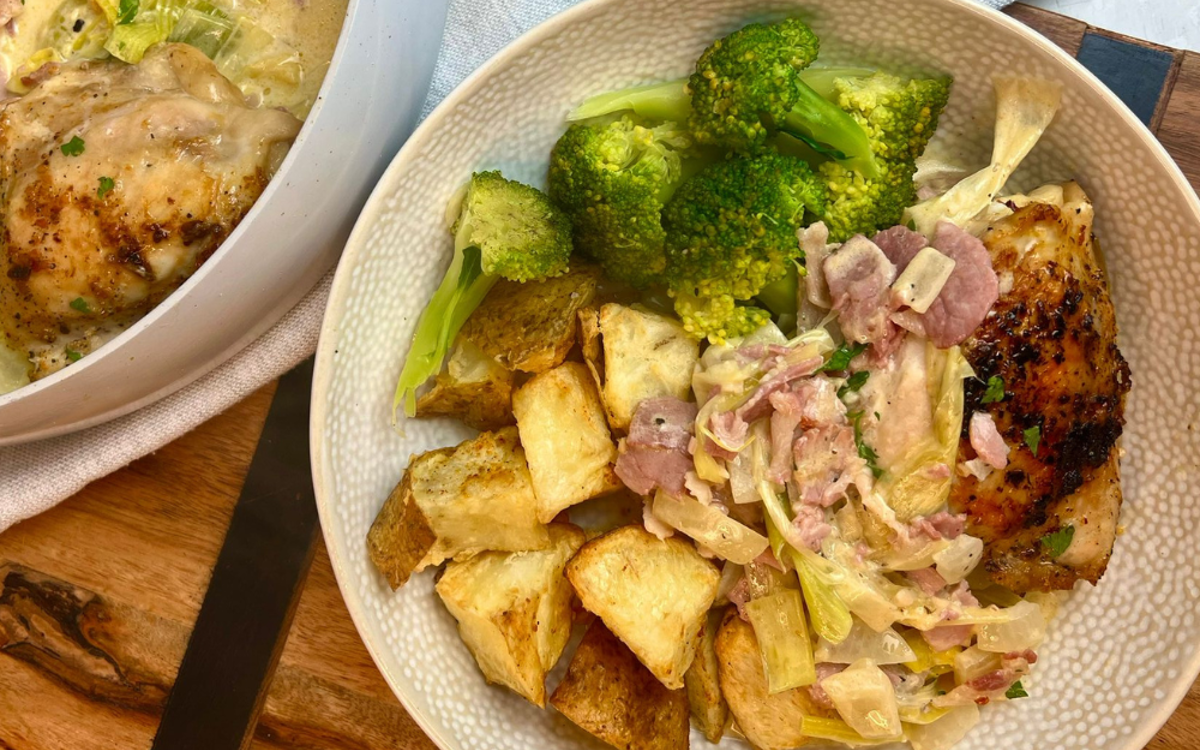 - To the same pan add your bacon and cook until crispy. Add in your onion and garlic and cook this for a few mins. Add in your butter and leeks and cook this through until everything is cooked. Season with salt and pepper.