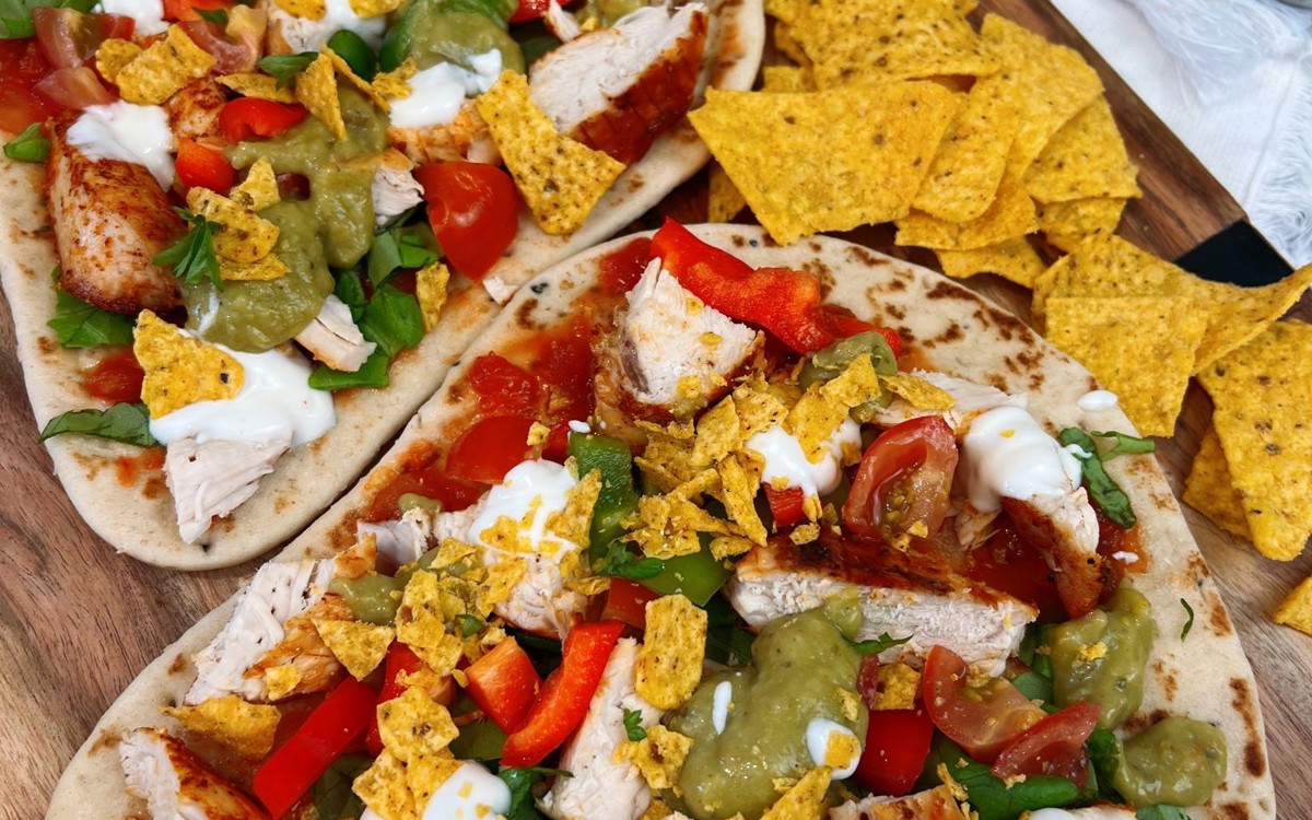 - top your bread with salsa, chicken, lettuce, chopped pepper, avocado or guac and some yoghurt mixed with garlic and herbs. Sprinkle on some crushed tortillas to finish.