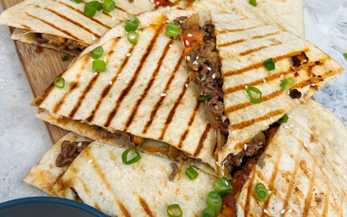 - take a wrap and add to the pan, on one side add some mince mixture, cheese, tomatoes, gherkins and burger sauce. Fold wrap over and cook on each side until crispy. Cut each quesadilla into 3 pieces.