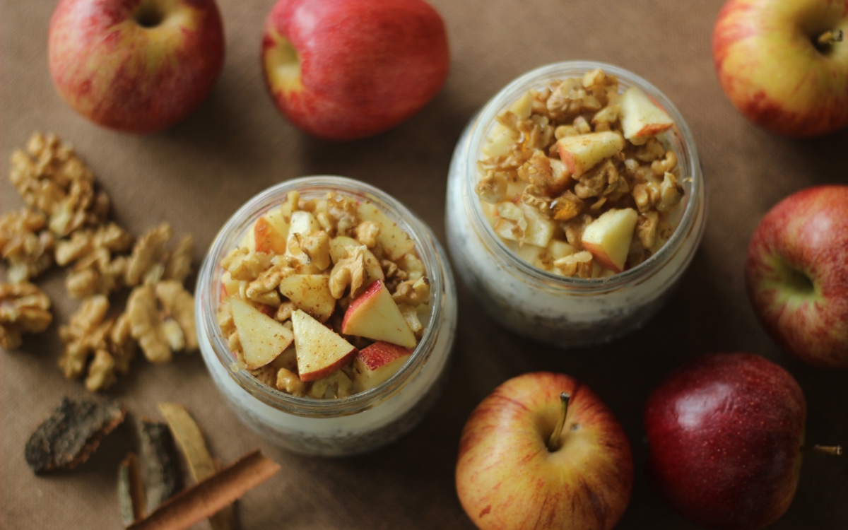 - Add the ingredients to a mason jar or other individual storage container in the order listed above: oats, cinnamon, chopped apples, almond milk, maple syrup, Greek yogurt, and flaxseed