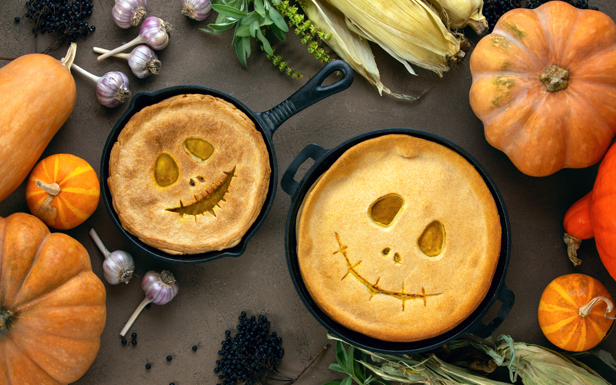 - Fit one half of the sheet of pastry into the base of a pie dish. In one half of the pastry sheet, carve out a spooky pumpkin face for the topping.