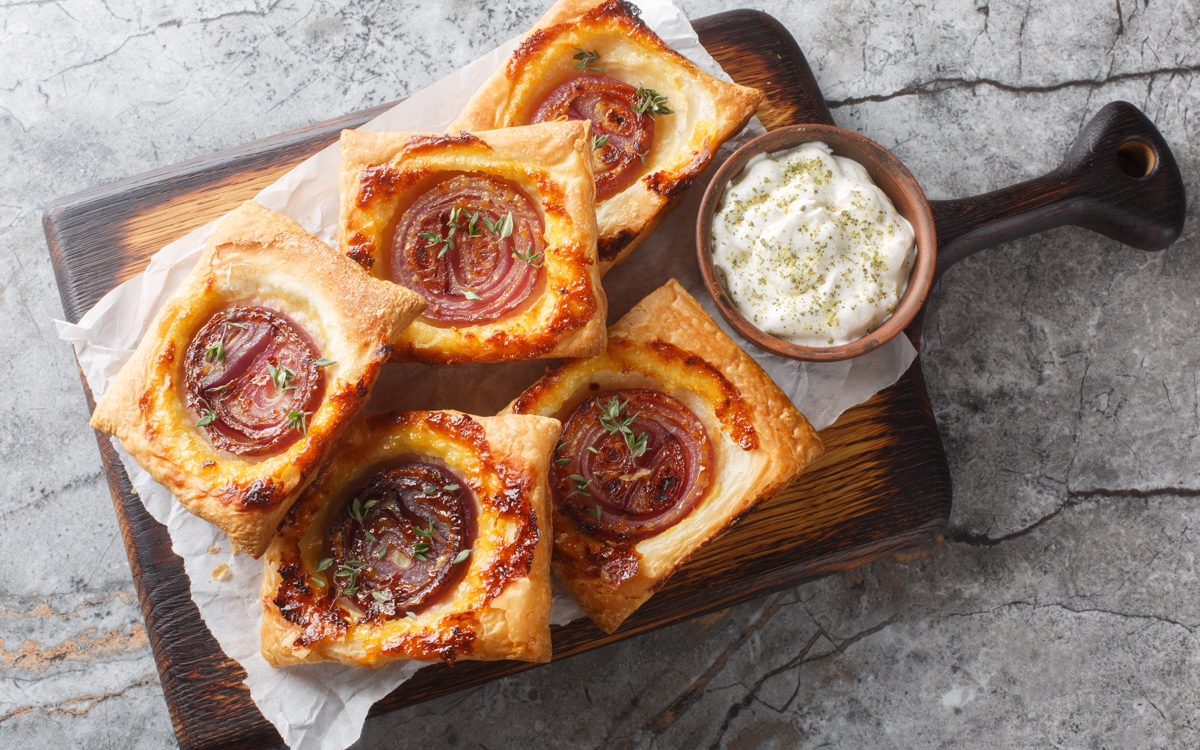 - Cut pastry into squares, score a border, and top with onions and cheese.