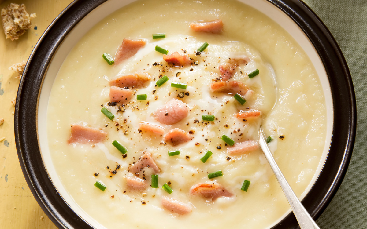 - Pour over the stock and simmer for 10 mins until the celeriac is soft. Stir in the cream and bring back to the boil. Take out the bay and thyme stalks, then purée the soup until smooth. Stir through half the thyme leaves and ladle the soup into bowls. Serve topped with the crispy pancetta, remaining thyme leaves and a drizzle of olive oil.