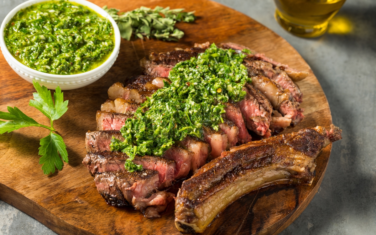 Try our Chimichurri—a vibrant sauce made with finely chopped garlic, diced onion, red pepper, dried oregano, chili sauce, white wine vinegar, olive oil, fresh coriander, and basil. This flavourful blend adds a zesty kick to any dish, perfect for grilling and more.