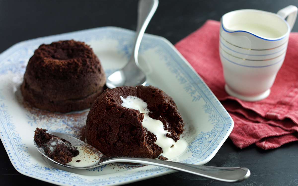 - Bake for 15 minutes at 180C, then invert onto serving plates and serve dusted with cocoa and with vanilla icecream or cream.