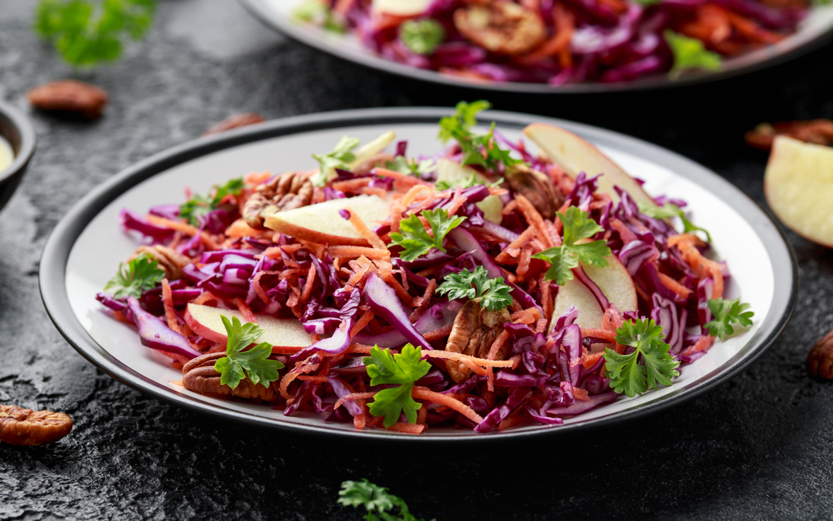 - In a large bowl, toss apples, cabbage, carrot, walnuts, and parsley.