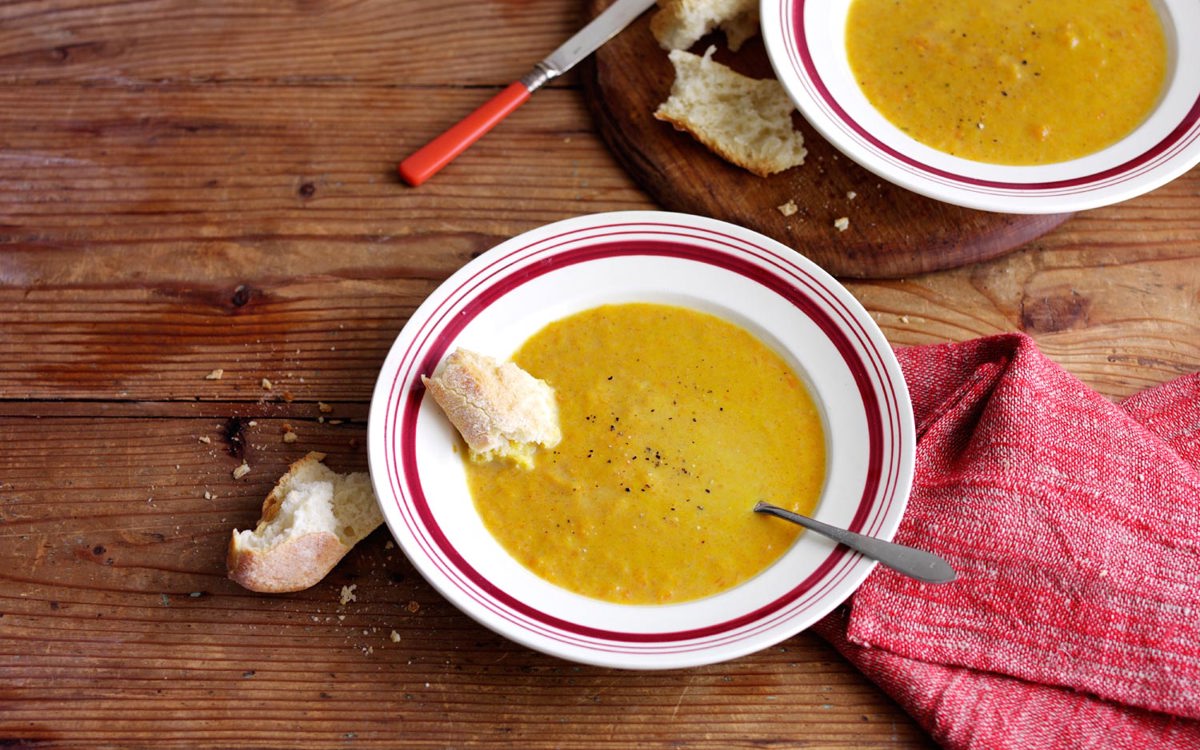 Heat a tbsp. of olive oil in a large pan, add a peeled and chopped onion and 500g chopped carrots. Cook gently for 10 minutes until the onion has softened then stir in 2tbsp mild or medium curry powder. Pour over 800ml hot vegetable stock, bring to the boil, cover and simmer for 15 minutes until the carrot is tender. Remove from the heat and use a hand blender or food processor to blend until smooth, stir in the milk and warm through. Serve with warm crusty bread.