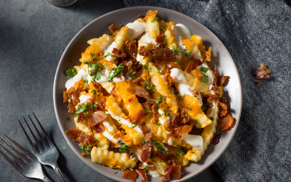 - Once cheese has melted, top with bacon bits, tobacco onions and sauce of choice!