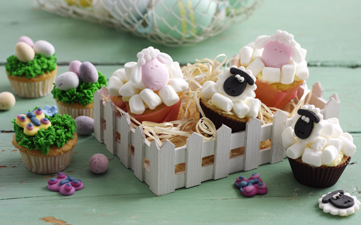 For the sheep: Spread the cakes with 1tsp ready made butter icing, cover with mini marshmallows and a sheep face (available online).