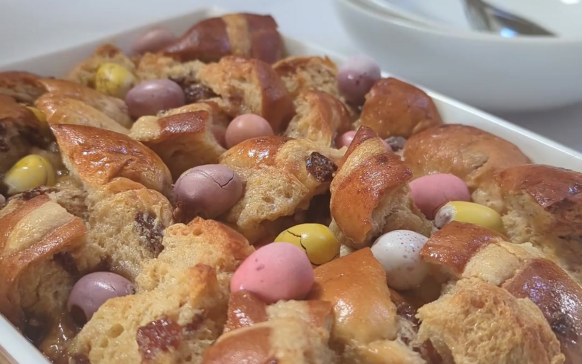 - Halve the buns and spread with the butter. Arrange in a large shallow ovenproof dish (approx 25 x 32cm), dot with the mini eggs.