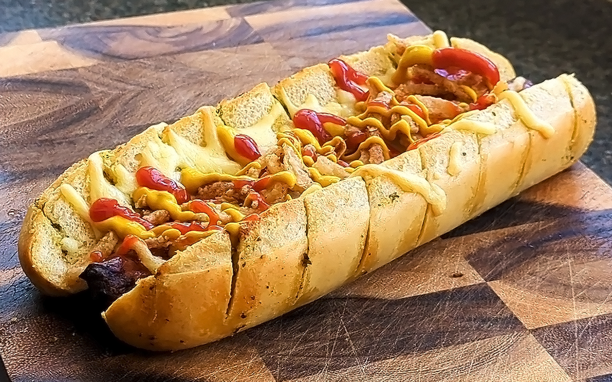 Enjoy the delicious combination of crispy garlic bread, hotdogs, and flavourful toppings in this unique and tasty dish!