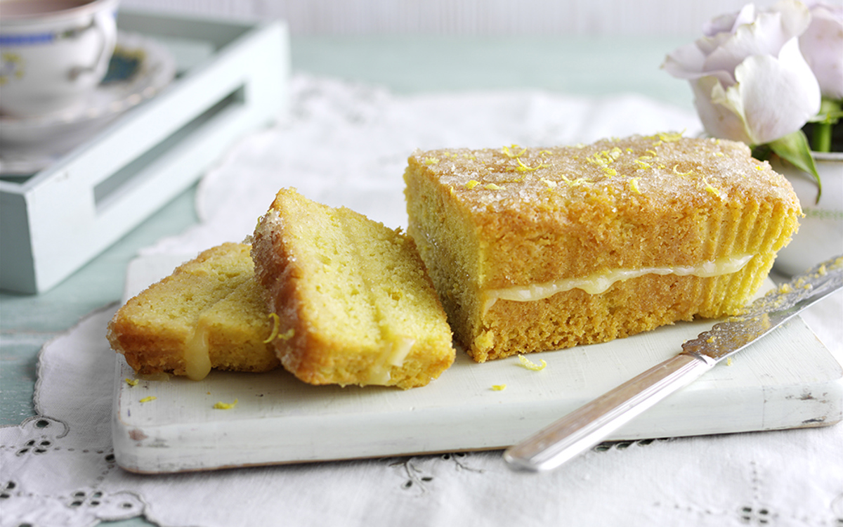 - Split the cake lengthways and spread with 3 tbsp lemon curd.