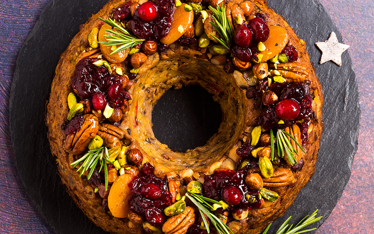 7. Remove from the oven and allow to stand for 10 minutes before decorating with the honey glazed nuts. Finally, add the cranberry sauce topping