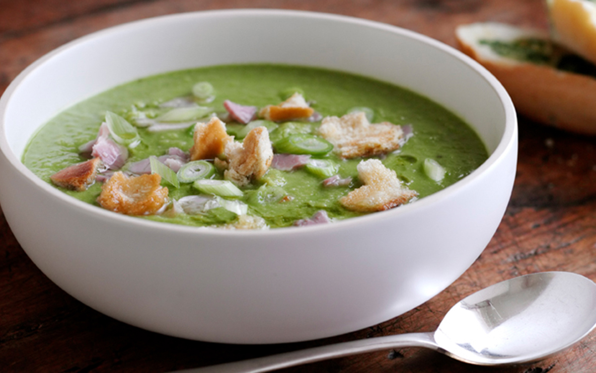 - Serve garnished with a sliced spring onion, another 50g torn, cooked ham and a drizzle of olive oil and garlic and herb baguette alongside.