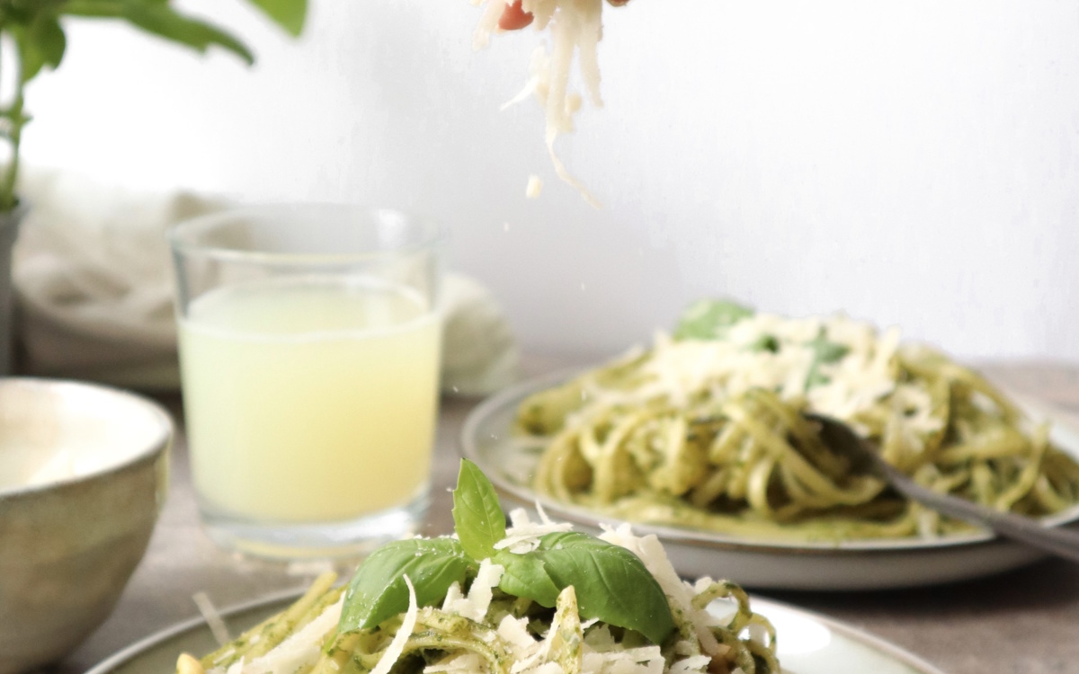 Place the basil, pine nuts, parmesan and garlic in a food processor