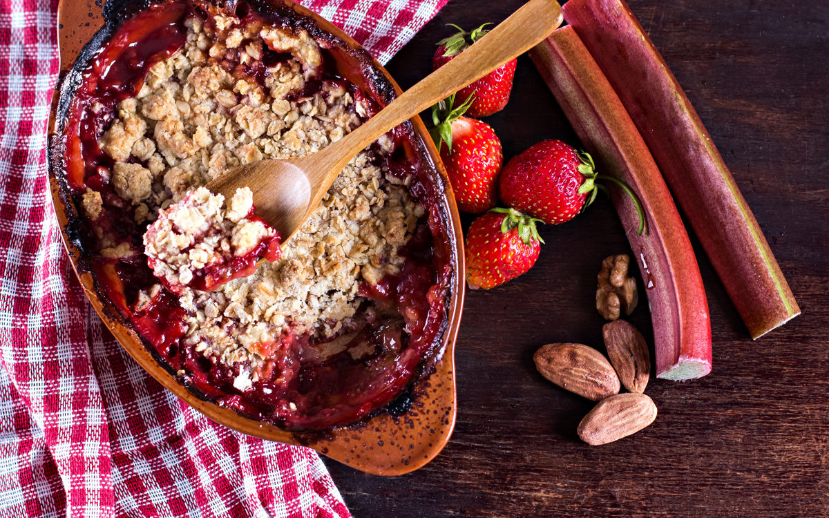 Tip 500g thumb-length chunks of rhubarb and strawberries into a saucepan with 100g golden caster sugar and 3 tbsp port, if using.