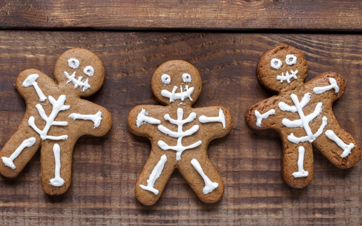 - Once baked, leave to stand on the cooling rack for 10 mins. When they are cool, you can begin decorating your gingerbread men into spooky skeletons. Pipe white icing to make the skull and bones for a scary snack.