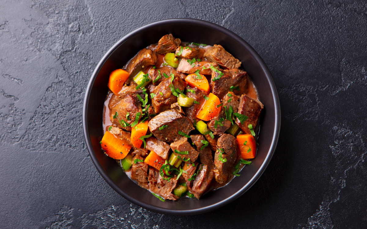- Add the beef stock to the steak and onion mixture along with the potatoes and carrots.