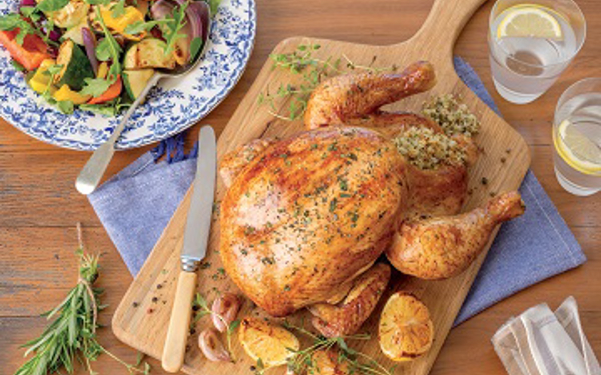 1. Place the chicken in a roasting tray and squeeze pour over it the lemon juice of one lemon and a drizzle of olive oil. Add 4 cloves of garlic to the roasting tray and season with salt and pepper. Roast in the oven as per cooking instructions on the pack.