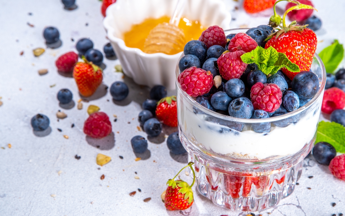 This simple parfait is made by layering fresh berries, yogurt, and crunchy granola, then finishing with a drizzle of honey. A tasty and healthy breakfast or dessert option.