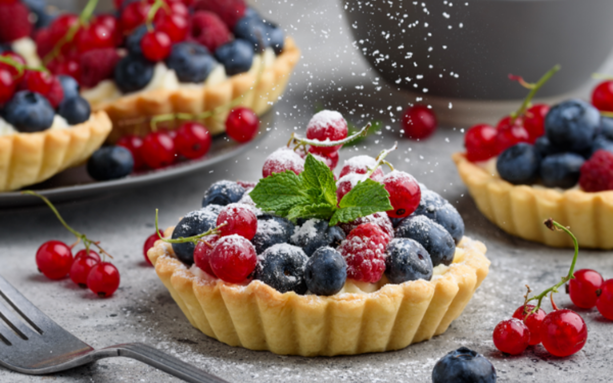 Halve or quarter any large strawberries and remove the stalks from any redcurrants, then mix the fruits together. Fill the pastry cases with crème pâtissière and pile a generous layer of fruits on top. Dust thickly with icing sugar and scatter over some chopped pistachios, if you like.