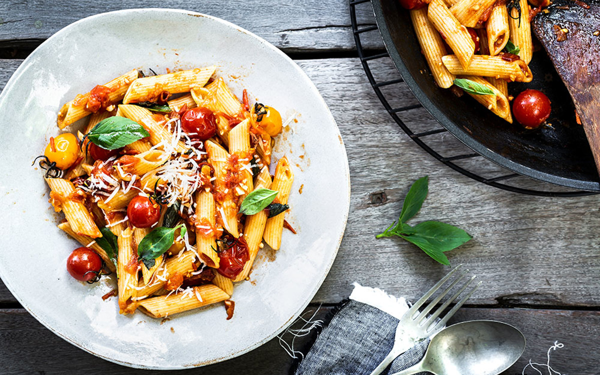5. Add the drained pasta to the tray and combine with the tomatoes. Check the seasoning